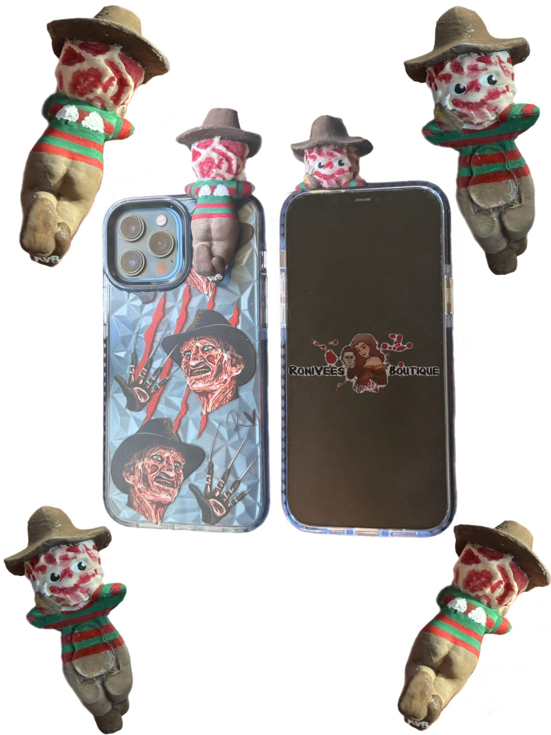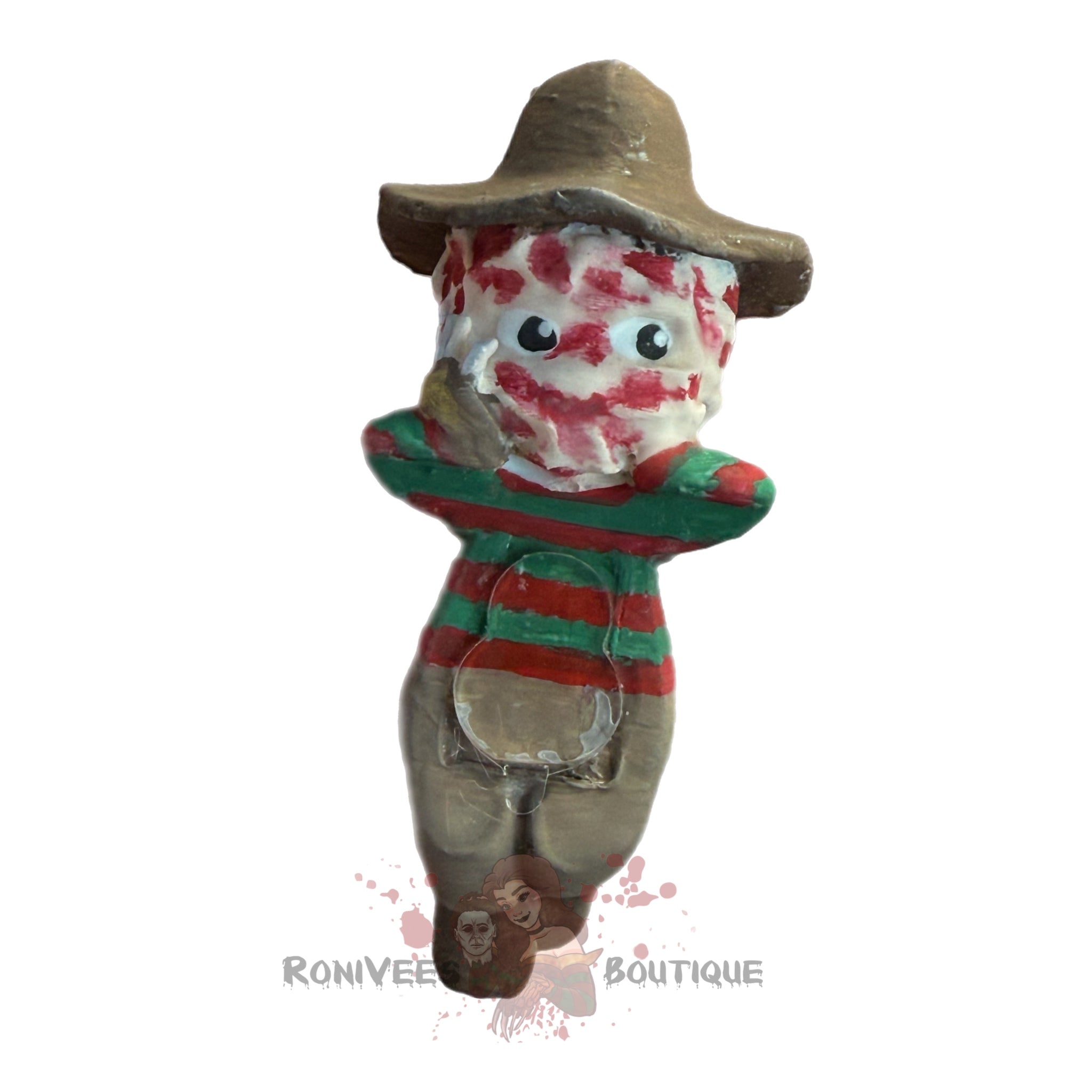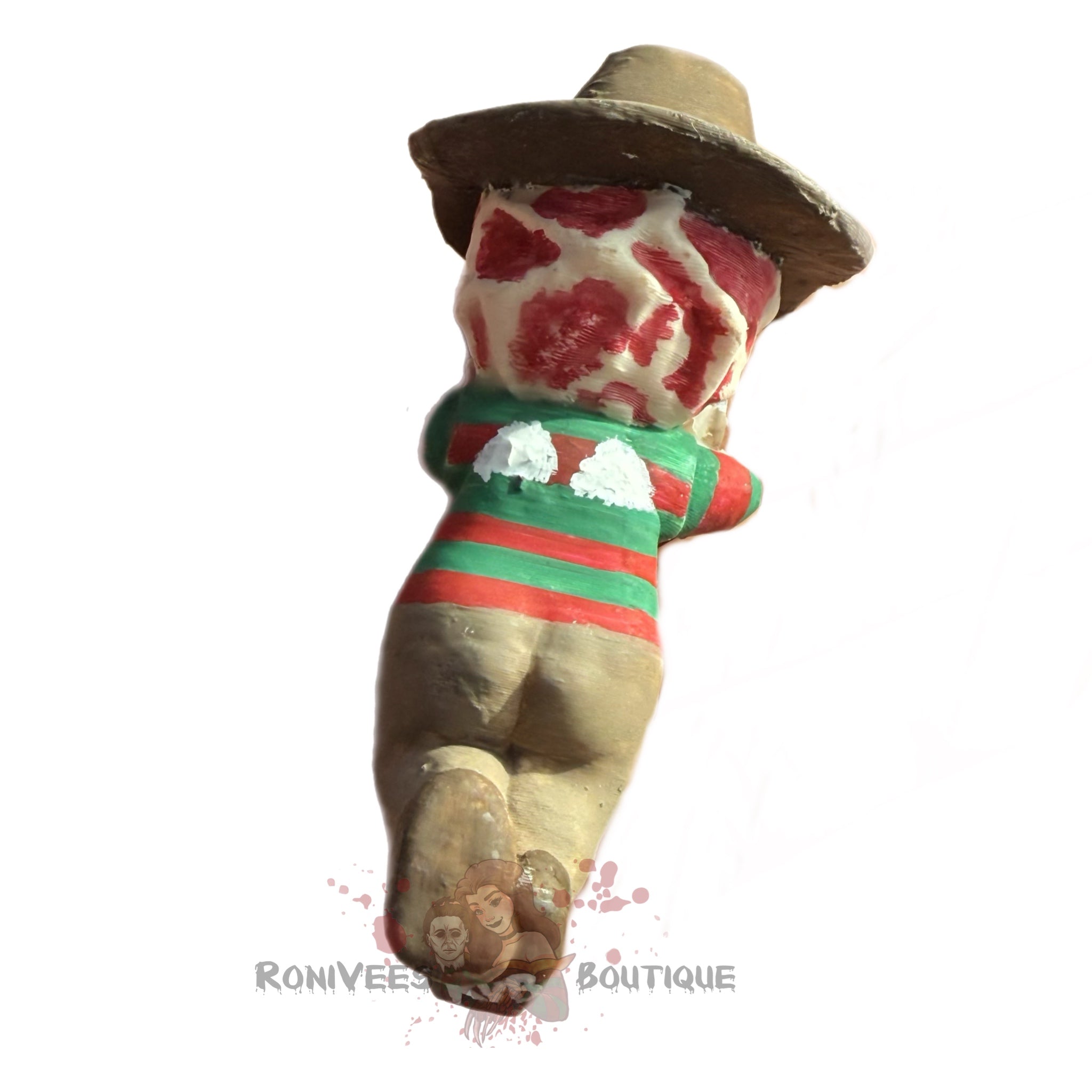 Inspired by Freddy Krueger, this twisted cherub blends innocent wings with Elm Street nightmares. Striped in red and green, halo cracked and claw ready, he brings all the fear of your childhood sleepovers — but in creepy-cute form.